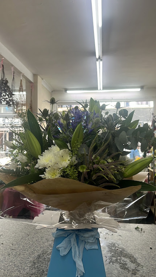 Handtied and delicately wrapped in a bubble of water and placed in a box with a bow.