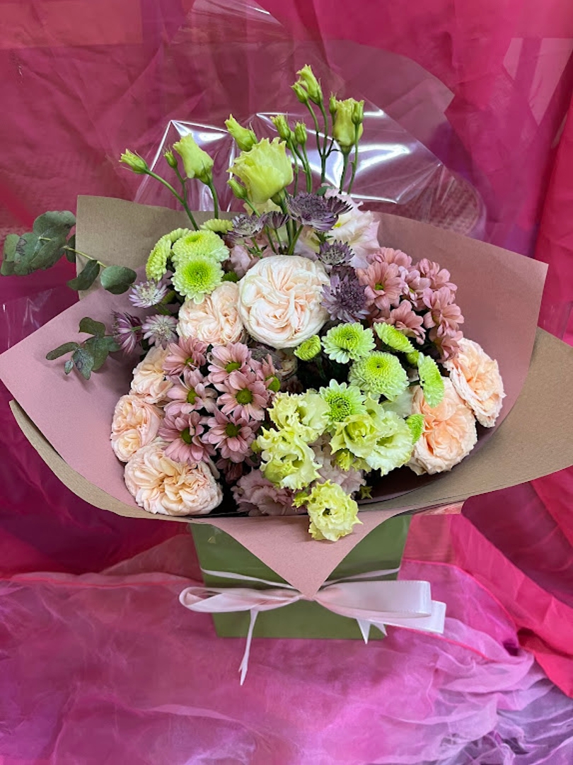Handtied and delicately wrapped in a bubble of water and placed in a box with a bow.