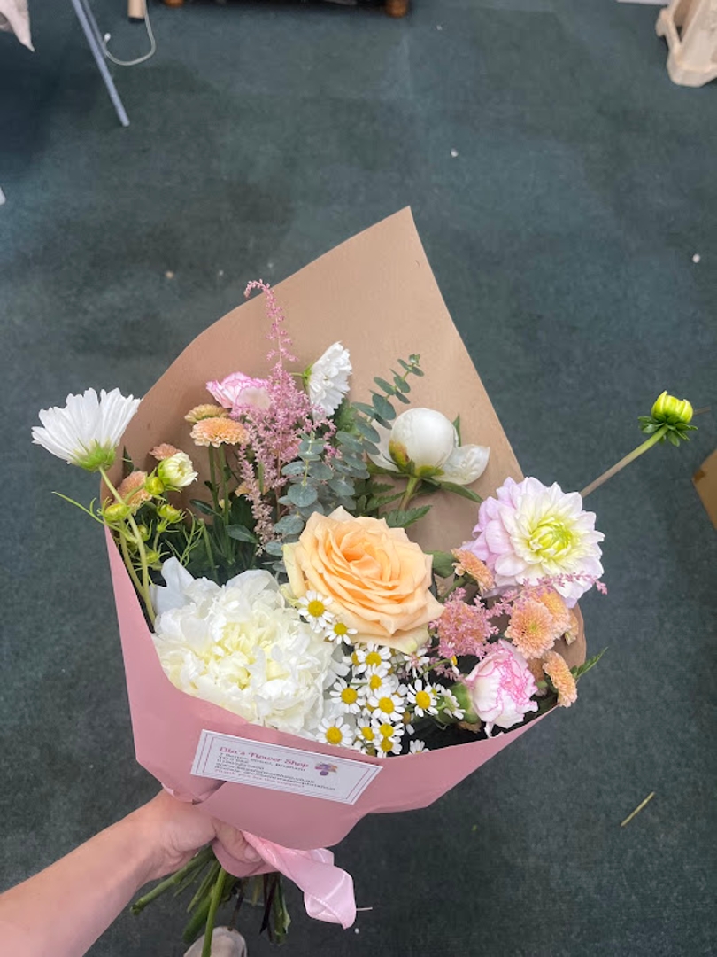 Handtied a wrapped in our Kraft paper with a bow. Simple, elegant and ready for a vase.