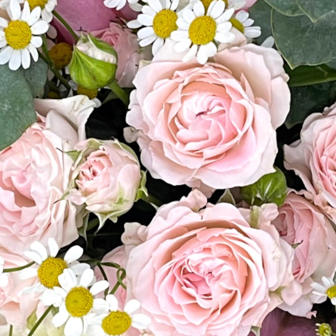 Seasonal blooms thoughtfully arranged into a rustic wicker basket.